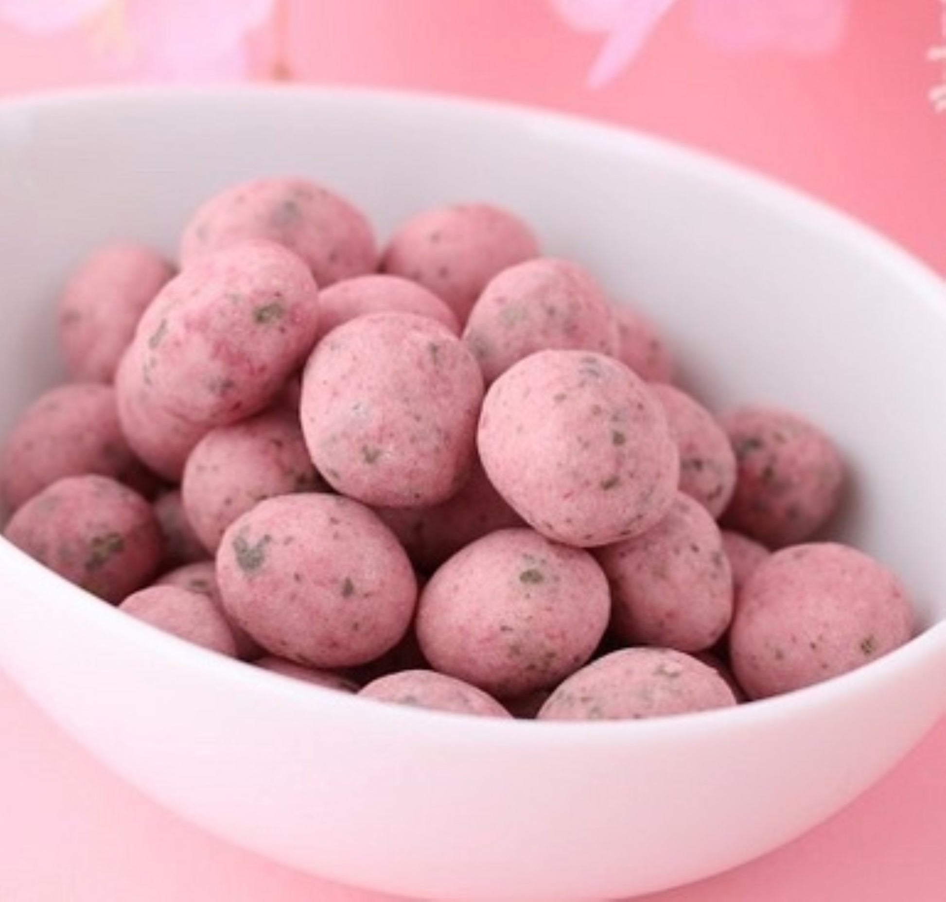 落花生をさくらの花と葉を練り込んだ生地で巻き込み、きれいなさくら色に仕上げました。
