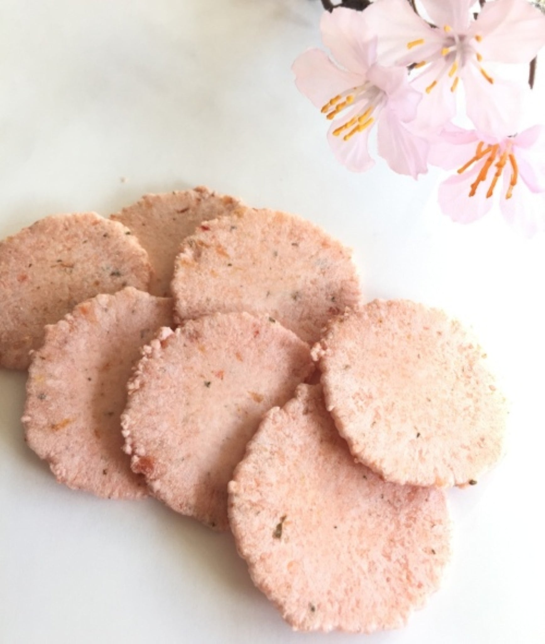 ソフトな食感の海老せんべい生地に桜葉ミンチを入れて焼き上げました。