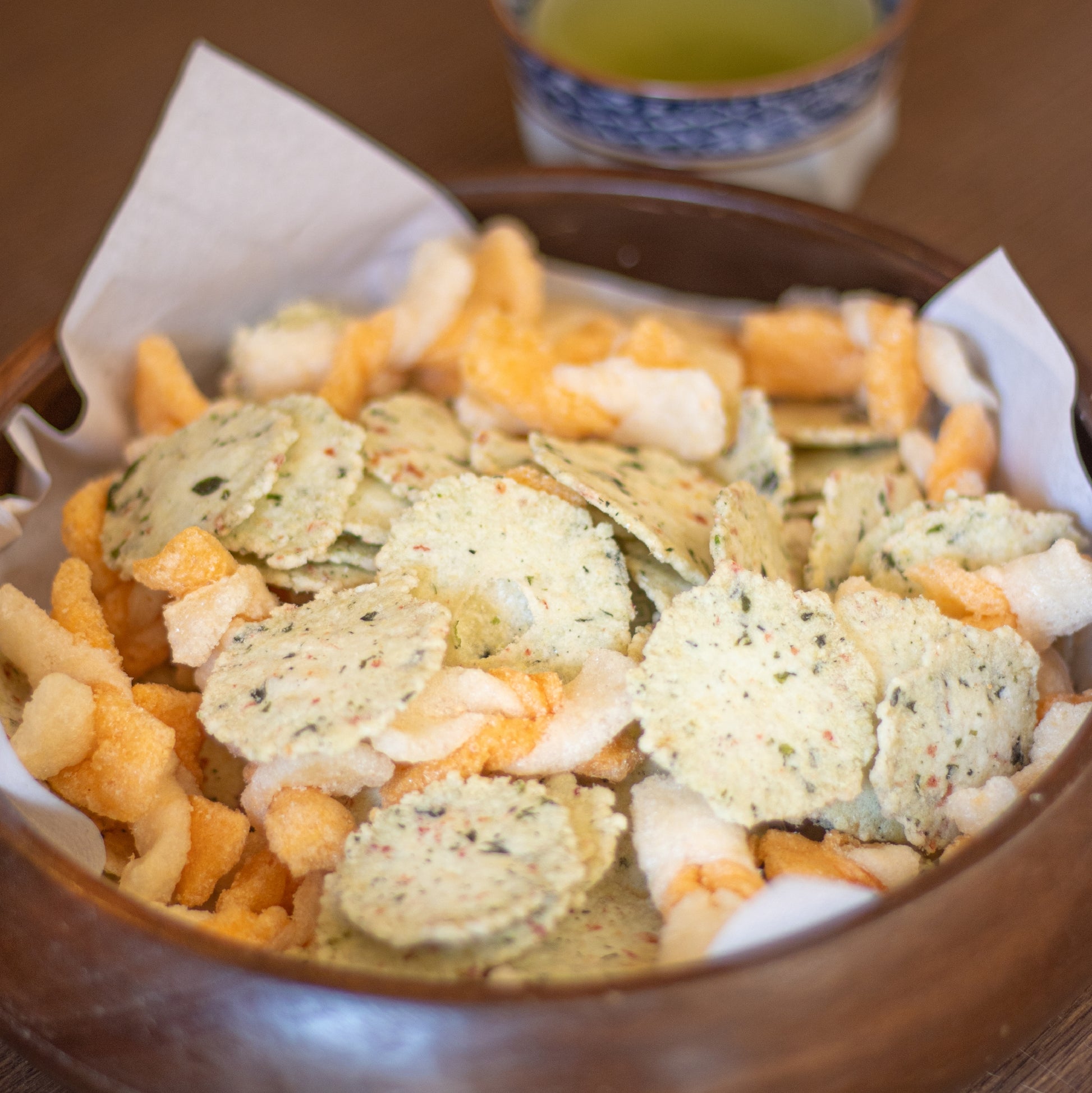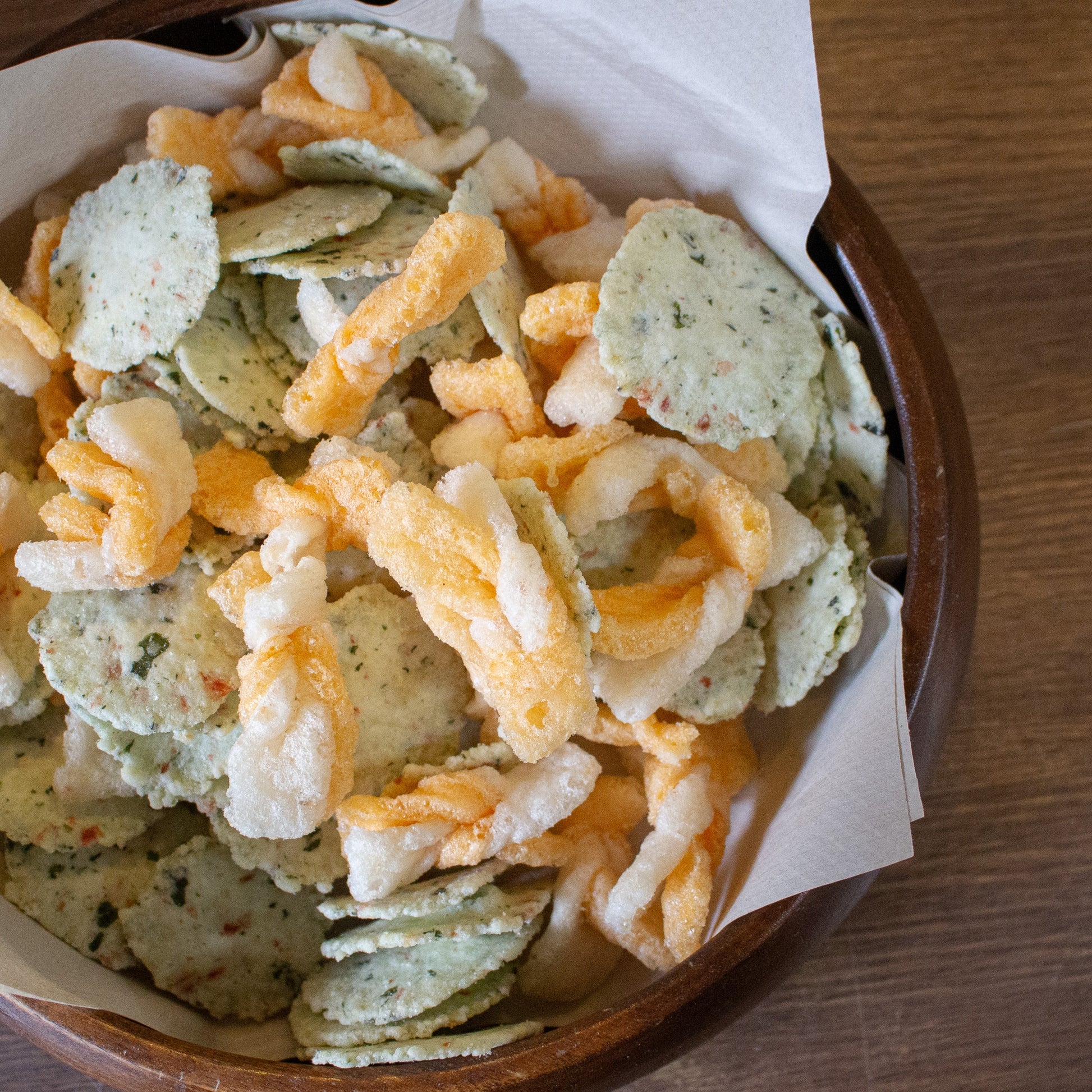 わかめを刻み込みわさびのパウダーでアクセントをつけ、膨らみをつけて味を載せやすくした生地の海老せんべいに、白とオレンジ2色の生地をリボン状に結んで焼き上げた、“ねじり”えびせんをアクセントに加えました。