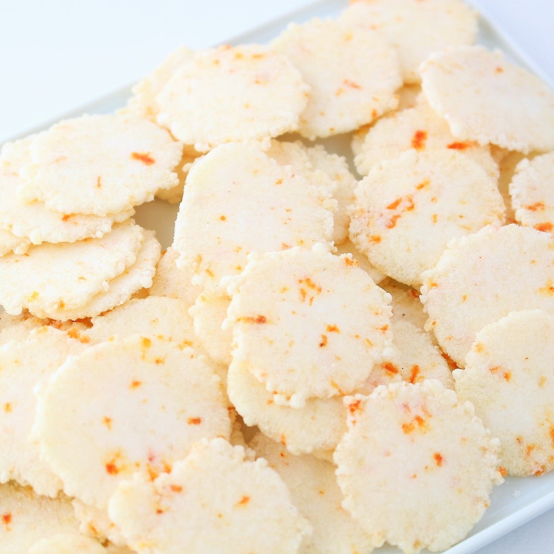 生海老と茹で海老にでんぷんを加えた生地をフライにしたとても軽い食感の海老せんべい。海老の香ばしい風味と、絶妙な塩加減が相まってついつい手が伸びるおいしさです。